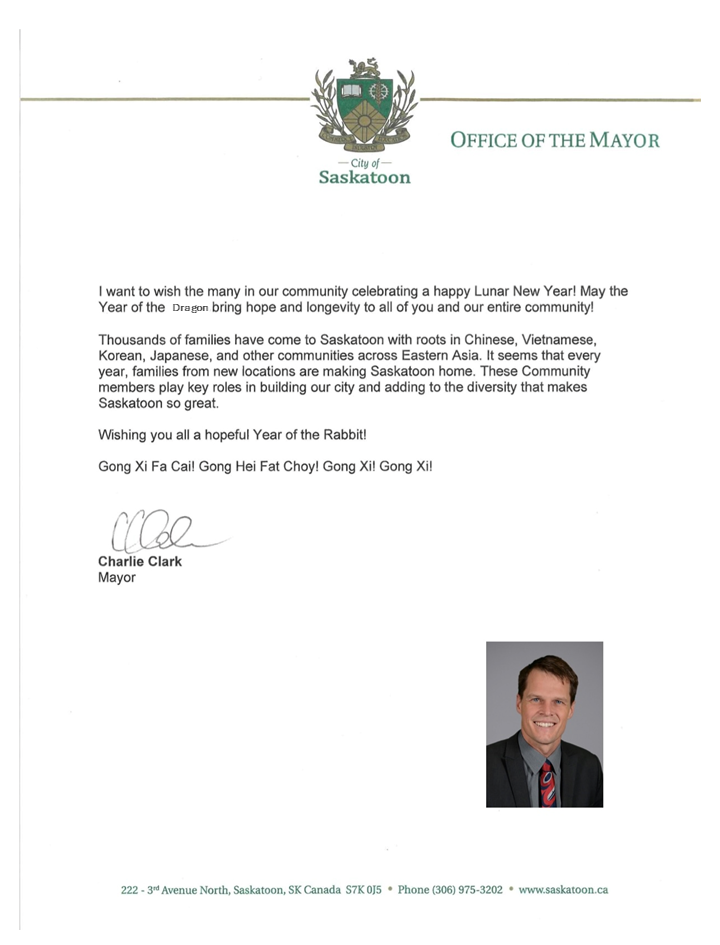 萨斯卡通联邦国会议员Kevin Waugh、财富人生财富管理有限公司创始人罗良志Eric Luo、加拿大皇家银行区域副总裁Aaron Martyniw上台致辞。萨斯喀彻温大学孔子学院中方院长刘艳红代中华人民共和国驻卡尔加里总领事馆王秀胜副总领事致辞。中国驻加拿大大使馆张拥军公参、萨斯喀彻温大学科研副校长兼孔子学院管理委员会主席Darcy Marciniuk通过视频为现场观众送上新春祝福。