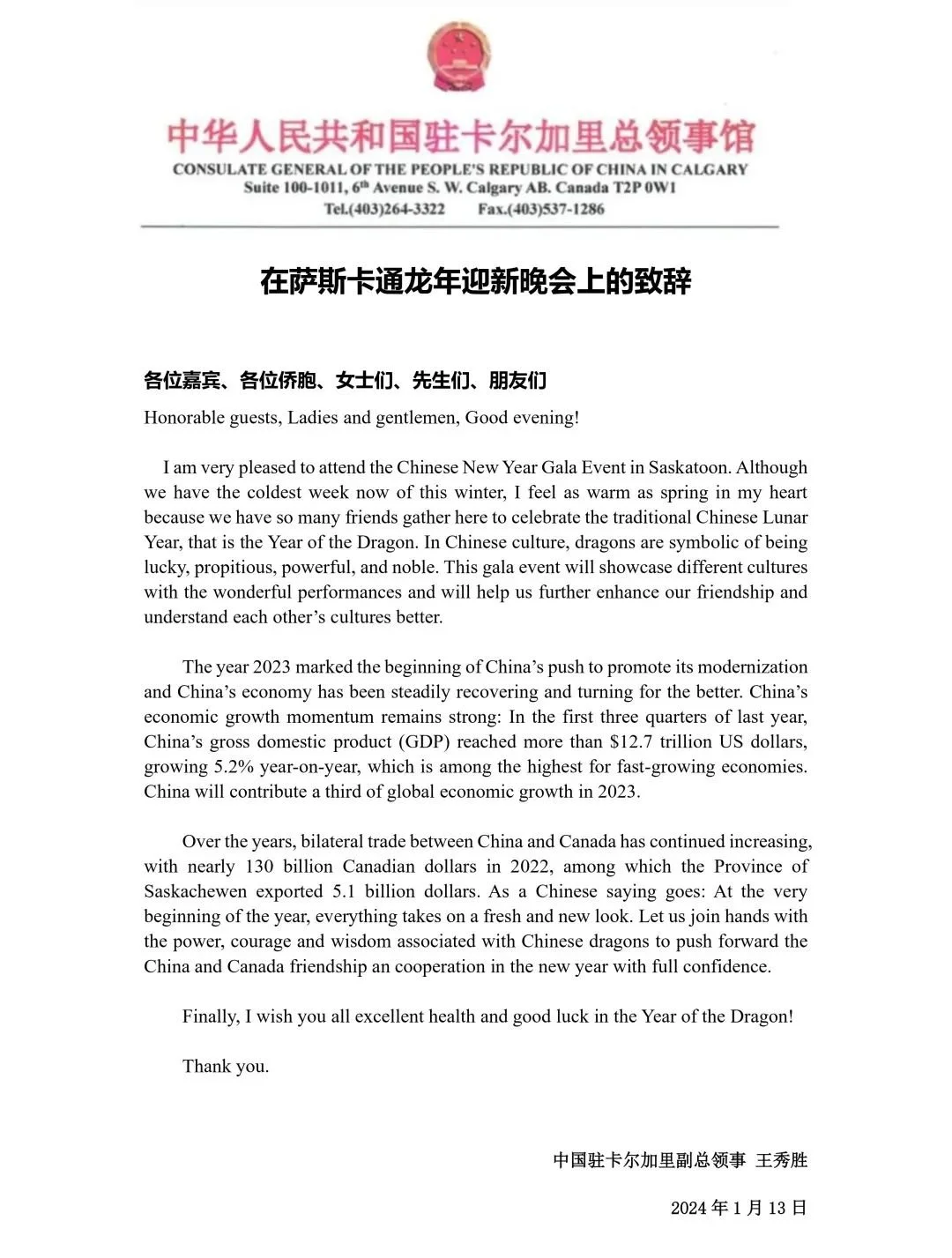 王秀胜副总领事发来贺信