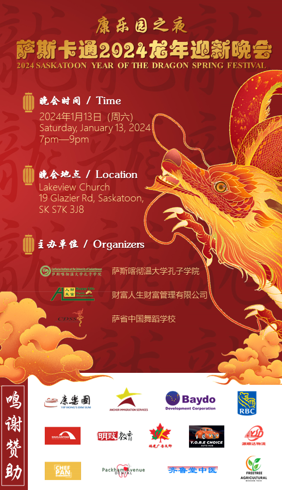 锣鼓喧天辞旧岁,张灯结彩迎新春!2024年1月13日,冒着体感零下50度的极度严寒,萨斯卡通 Lakeview Church 依旧灯光绚烂人头攒动 —— 由财富人生财富管理有限公司再度携手萨斯喀彻温大学孔子学院及萨省中国舞蹈学校共同主办的“萨斯卡通2024龙年新春晚会”,在此隆重开幕。