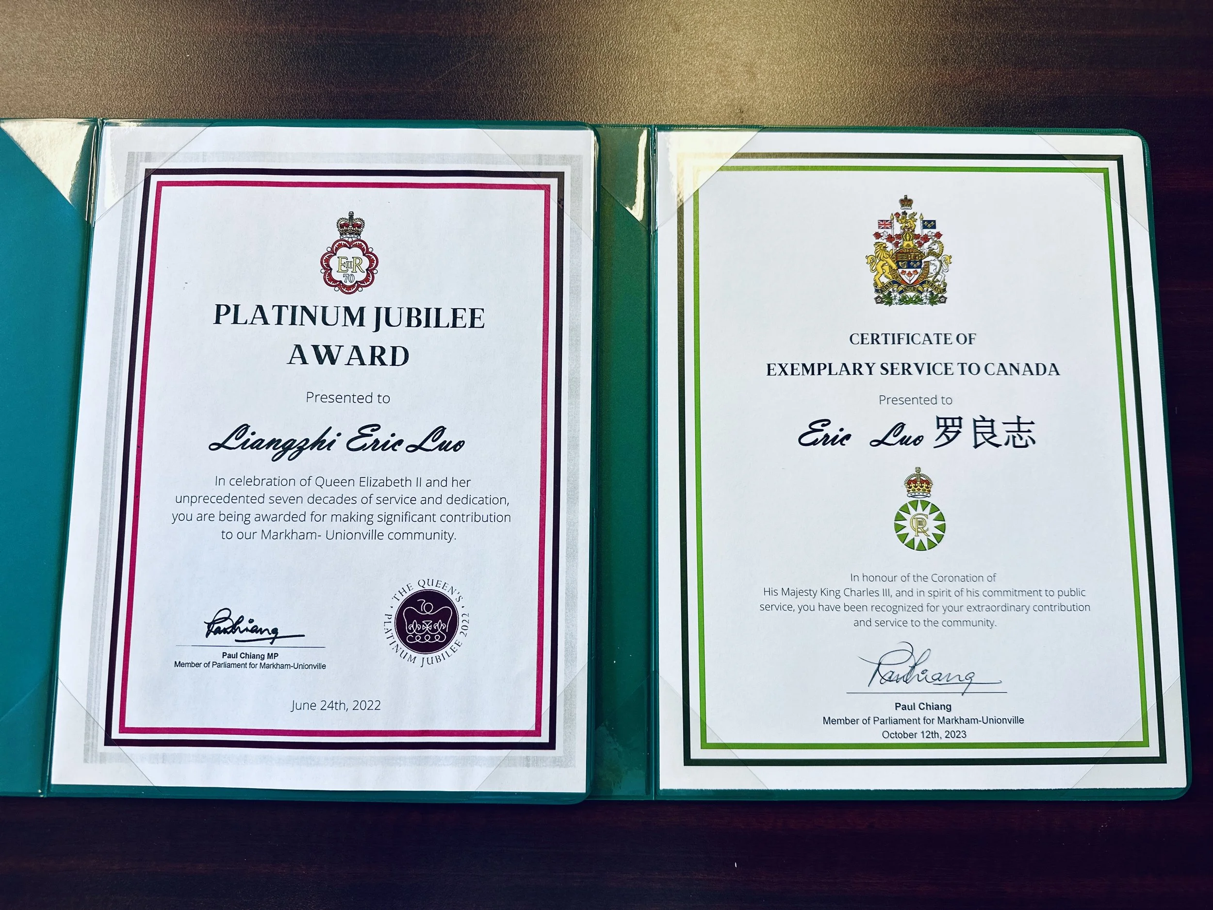 今天,财富人生创始人罗良志先生接受了由加拿大联邦国会议员、负责移民、难民与公民事务的国会秘书Paul Chiang 蒋振宇先生代为颁发的、英国国王查尔斯三世授予的首批海外荣誉服务奖章,以表彰罗先生为加拿大社会发展和社区建设所做出的杰出贡献。